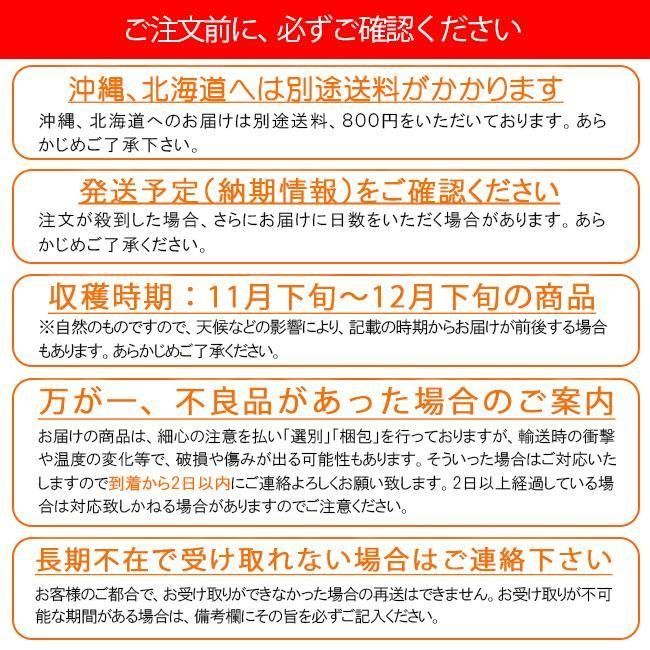 ■長期不在について | お客様のご都合や長期ご不在による配達センターでの保管(2日以上)によって傷みが発生した場合の返品・交換の対応はできません。 お受け取りが不可能な期間がある場合は、備考欄にその旨を必ずご記入ください。